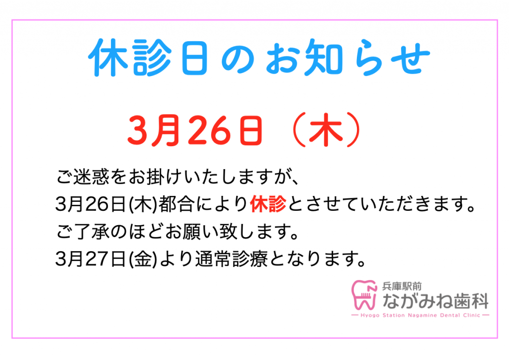 令和8年3月26日(木)は都合により休診とさせていただきます。